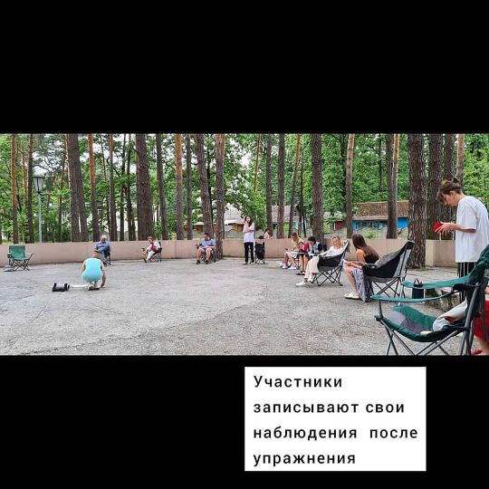 В парах - на доверие и замечание Другого: сходства с ним и различия, опыт безоценочного наблюдения и свидетельствования другим. С обсуждением полученного опыта. Все мастерские я оформляла с ясной структурой и последовательностью этапов. Обсуждала на супервизии свои волнения и переживания, желание контролировать процесс. Заземлялась и уплотняла свое понимание и отношение к работе с группой людей.